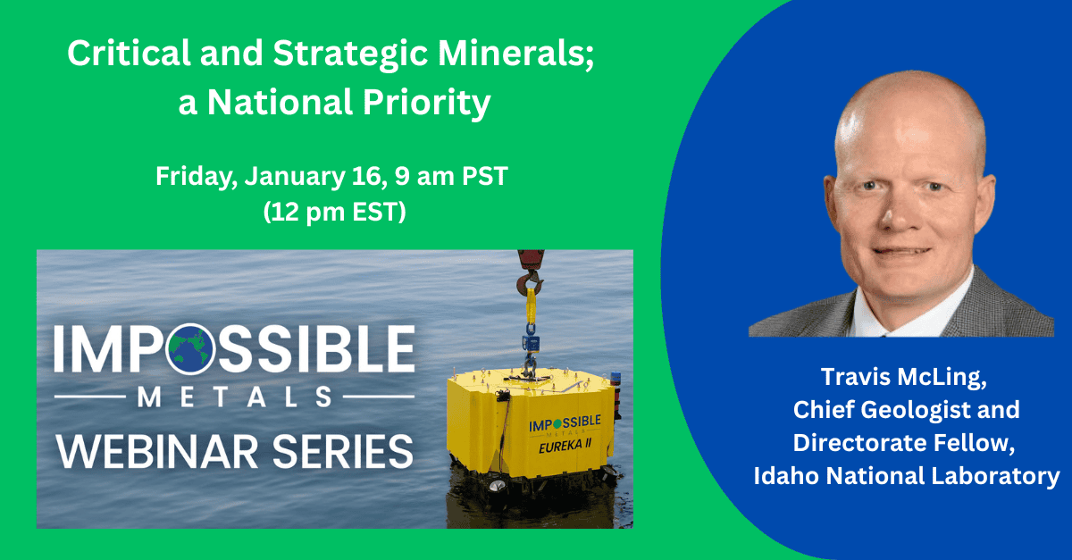 Impossible Metals Webinar Series: Critical and Strategic Minerals; a National Priority with Travis McLing on Friday, January 16, 2026 at 9 am PST (noon EST)Impossible Metals2026-01-09T16:09:15-08:00January 9th, 2026|