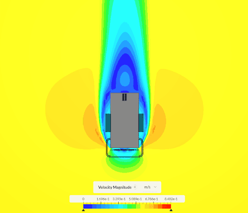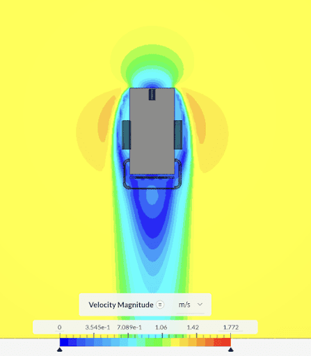 The graphics below show the velocity of the water around the vehicle from the vehicle’s frame of reference. The CFD analysis reports the average z (vertical) force which is used to calculate the resulting Cd at each velocity.