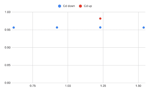 The chart below shows the calculated Cd for Eureka III vertical travel based on a series of CFD simulations conducted at different speeds and directions. There is a slightly higher Cd for ascending, compared to descending, and both have a Cd less than the assumed Cd in the TEA.