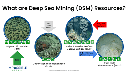 Polymetallic Nodules (PMN) contain nickel, cobalt, copper, and manganese. These potato-sized rocks are found on the abyssal plains lying on the seabed sediment. They do not require cutting, blasting, or tunneling. This is the exclusive focus of Impossible Metals. Cobalt-rich Ferromanganese Crusts (CFC) mainly contain cobalt. They form on sediment-free rock surfaces around oceanic seamounts, ocean plateaus, and other elevated features. Seafloor Massive Sulfides (SMS) mainly contain copper, lead, zinc, and some gold and silver. They appear on and within the seafloor when mineralized water discharges from a hydrothermal vent. The hot, mineral-rich water precipitates and condenses when it meets cold seawater. Most proposed mining is focused on extinct hydrothermal vents. Rare Earth Element Muds (REEM) mainly contain rare earth elements in the seabed sediment.