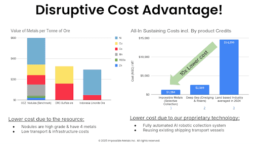 The first is the improved economics for a fully operating system. This is achieved through reduced capital expenses (CapEx) by eliminating the need for a dedicated surface production vessel to support equipment such as a riser system. With the Impossible Metals approach, the transport ships pull the robots from the water, collecting the ore without needing ship-to-ship ore transfer.